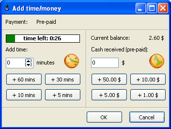 Select whether a customer uses pre- or post-paid model, inspect how much time left on a customer account, let a server automatically close pre-paid sessions, calculate extra pre-paid amount when extending session time. |