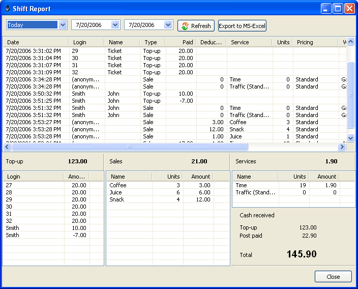 Create, print, sell, delete/recover pre-paid tickets. Distribute tickets among your employees (agents). Keep track of a ticket status. Delete all unused tickets. Use a ticket to top-up a customer session. Export data to MS-Excel for further analysis. |