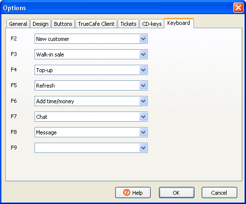 You can now customize your F2-F9 buttons to use them as keyboard shortcuts. The following commands are available: create a new customer, top-up a customer account, add time/money to a customer session, make a walk-in sale, send a message, open the chat window, refresh the main screen. |