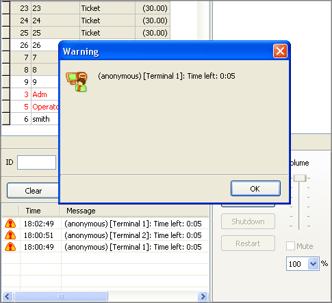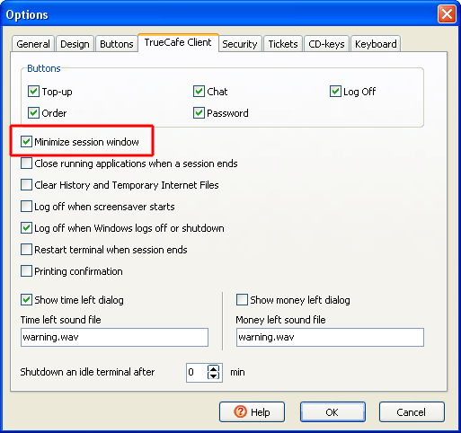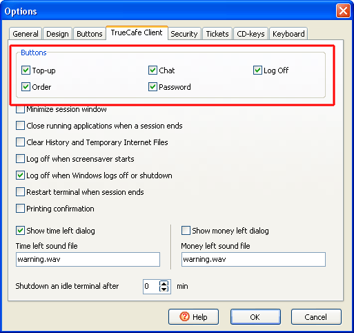 Show time left message and play warning sound not only on the client side but on the server side as well. Use TrueCafe options to enable this feature. |