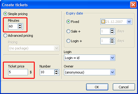 Create tickets in a very simple way. Specify tickets minutes and price (e.g. 60 minutes = $5). |