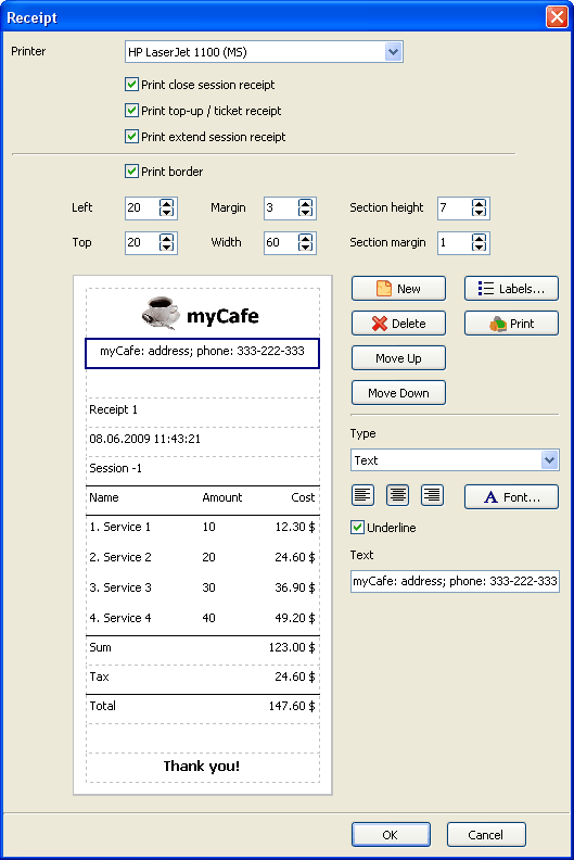 A receipt consists of a number of sections. A section can be text, a picture (e.g. the cyber cafe logo), a service list, tax, sum total, etc. You can add, delete or modify any section, move a section up or down, change font and alignment, select a picture from disk to put on a receipt, underline a section.