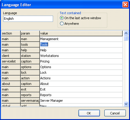 Moremover, TrueCafe provides an integrated tool called Language Editor. It help you directly edit the language settings from the running program. Press Ctrl-F11 in either TrueCafe Administrator, Report or Client on any window to open the Language Editor. By default, Language Editor displays the text messages from the last active window, but you can switch it to the "show everything" mode. Edit the text and press "OK" to save the changes or "Cancel" to discard them.