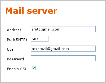 Set Address = smtp.gmail.com, Port = 587, Enable SSL options: