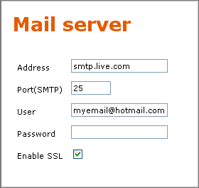 Set Address = smtp.live.com, Port = 25, Enable SSL options: