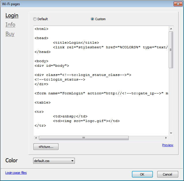 Select a page to customize (Login, Info, Buy). Click Custom to edit a page. Click Default to reset changes. Cick Picture to insert a picture at the cursor position. Select a color theme.