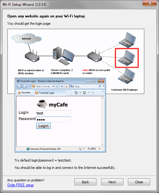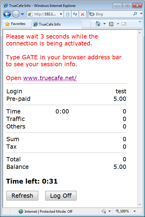 Try opening any website from your Wi-Fi laptop and get the login page. Type your customer/ticket login/password to start a session and continue browsing the web. Try login/password = test/test by default.