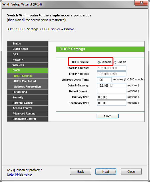 Depending on your router model switch it to the access point mode or if there is no such an option, disable router DHCP.