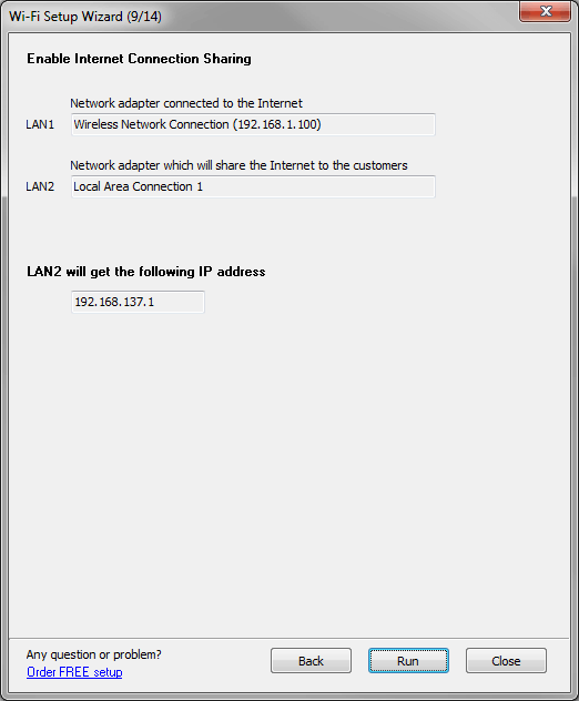 Select a LAN card which connects the computer to the Internet, a LAN card shared to your customers and your Wi-Fi router model.