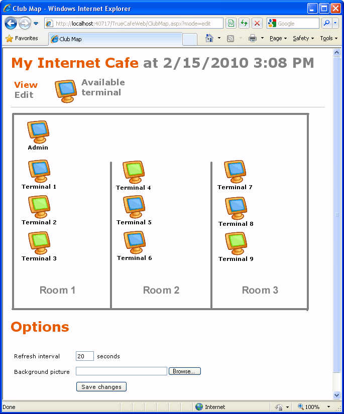 Setup the info display at your shop or cafe receiption so that an incoming customer can locate an available terminal himself. Use your Internet browser to open TrueCafe Web Access and select Club Map main menu item. Click the Edit link to change options and move the terminal icons on the map. Upload your club map layout picture. Available in the latest beta version |