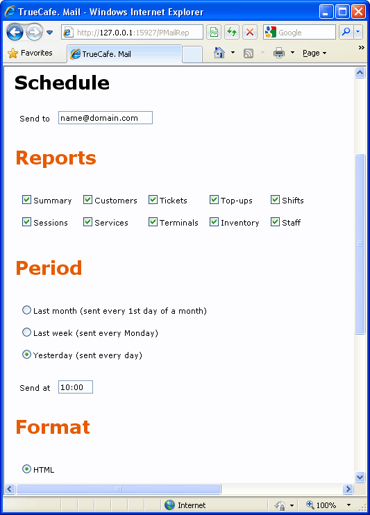 Receive your Internet cafe reports automatically by email every day, every Monday or every 1st day of month. Open TrueCafe Web Reports, Mail options, specify which reports you would like to get and select time period (last month, last week, yesterday). Enter your email address and your mail server parameters. Click the Send now button to test mail sending. Available in the latest beta version |