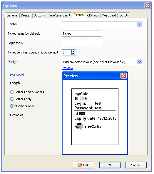 Customize your ticket print layout, add/remove captions, add your cafe logo, etc. Edit tickets.layout file in the TrueCafe folder. Preview ticket layouts. Available in the latest beta version |