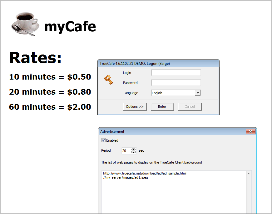 Display advertisement on your terminals on the TrueCafe Client background. An advertisement can be a web page or picture. Use TrueCafe main menu > Setup > Advertisement to configure the ad list and display interval. Available in the latest beta version |