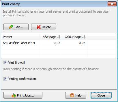 Configure all your print options, such as monochrome/colour page rates, print firewall and confirmation on the same screen: TrueCafe main menu > Setup > Print billing Available in the latest beta version |