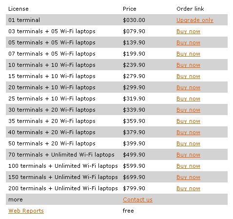 Wi-Fi laptops doesn't count in terminal number from now. When you purchase a license, you get a number of extra Wi-Fi connections for free. |