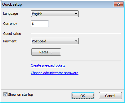 Use Quick setup screen to configure base options when you install the program: change currency, setup guest rates, create tickets, change administrative password, etc. |