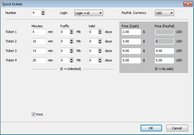 Specify ticket minutes, traffic amount and expiry days, cash and PayPal price. If PayPal price is not specified (= 0), a ticket is not available for credit card/PayPal sale.