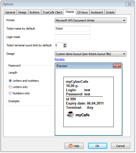 Customize your ticket print layout, add/remove captions, add your cafe logo, etc. Edit tickets.layout file in the TrueCafe folder. Preview ticket layouts.
